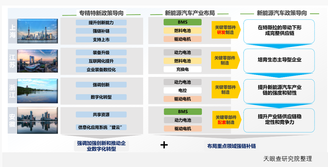 在“专精特新”政策和专项产业政策引导下,长三角城市群以特斯拉入驻上海临港为标志,形成了极具特色的新能源汽车产业集群。