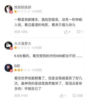 在评论区,不少网友都给这部电影打出了“一星”的评价,有人大呼“这部电影只值9块9”,有人怒道“9.9元去看的,看完受到的内伤998都治不好”。尽管网友的言语有些夸张,可正说明了一件事——他们在乎的,不仅仅是票价到底有多便宜,而是影片质量到底好不好。