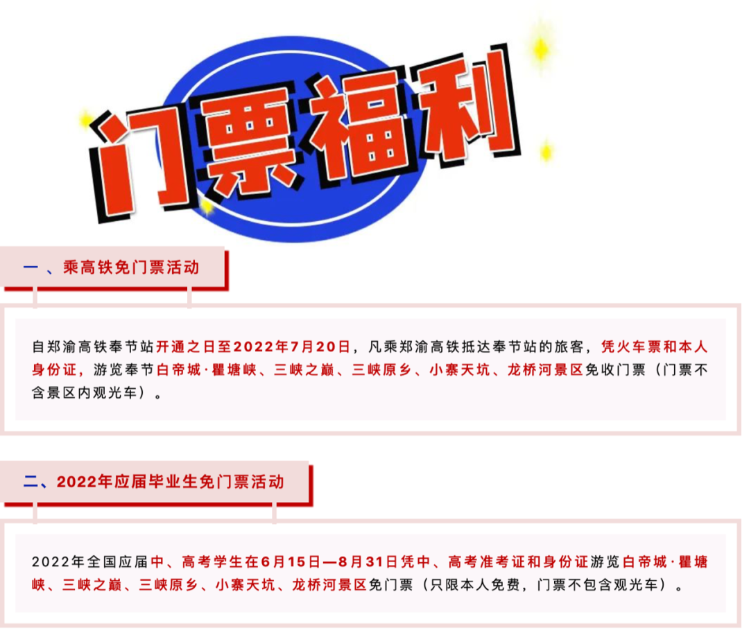 自郑渝高铁奉节站开通之日起至2022年7月20日,凡乘郑渝高铁抵达奉节站的旅客凭火车票和本人身份证,可免费游览奉节白帝城·瞿塘峡、三峡之巅三峡原乡、小寨天坑、龙桥河景区(不含景区内观光车)。