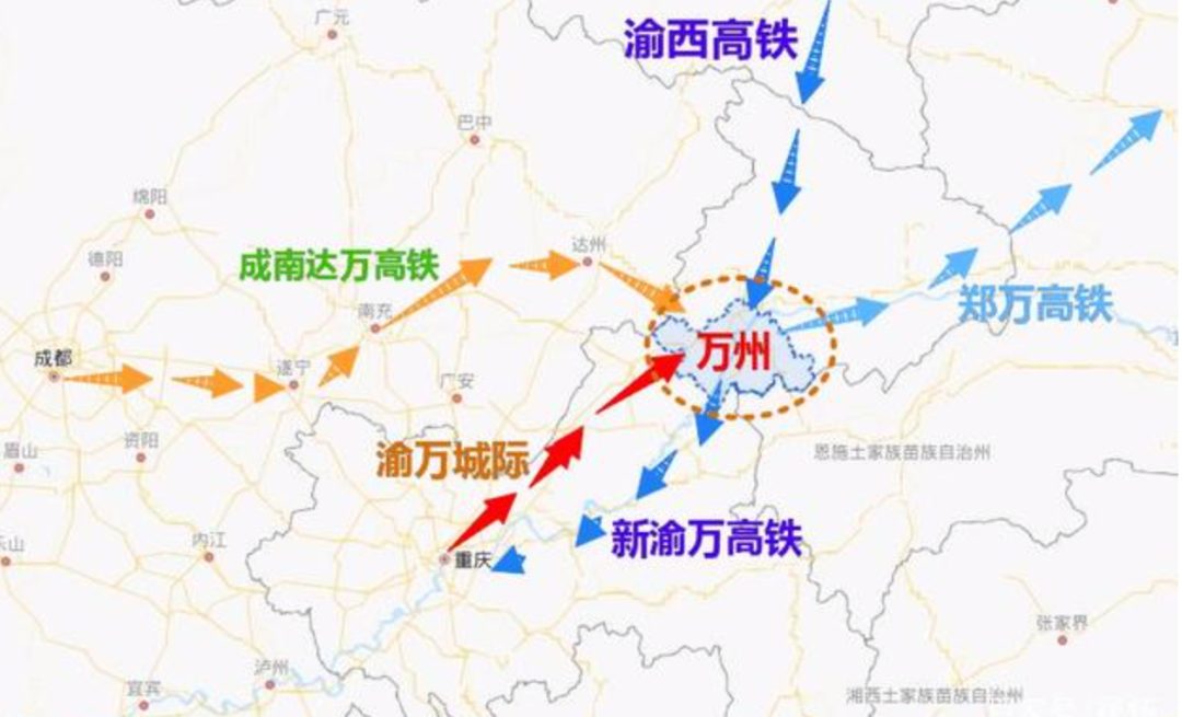 万州将拥有渝万城际铁路、郑渝高铁、渝万高铁、成达万高铁、渝西高铁等5条高铁,以及达万铁路、宜万铁路等普铁,形成轨道上的“半小时万达开”交通格局,基本建成全国性综合交通枢纽城市。