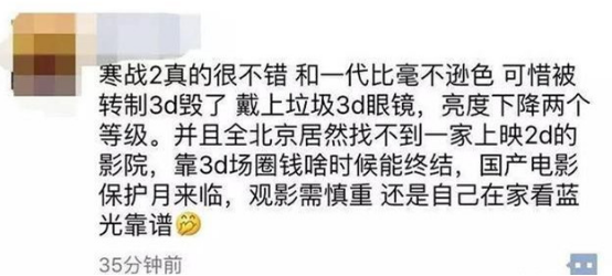 一边是并无必要且效果糟糕的制作环节(3D转制),一边又是观众怨声载道却必须忍受的放映版本,如此拧巴的市场选择,也折射了中国电影市场发展背后的隐疾。