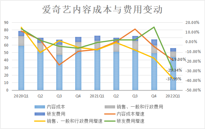 在成本和费用方面,今年一季度爱奇艺营收成本为60亿元,同比下降了16%。这主要是由于占比最大的内容成本的降低,版权购买、内容制作成本高企是多年来长视频平台亏损的主要原因。今年Q1爱奇艺内容成本为44亿元,同比下降19%。