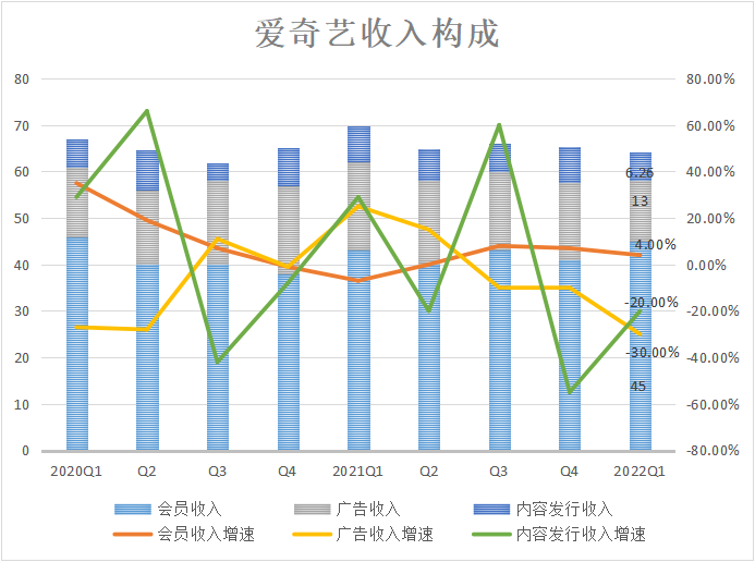 今年一季度,爱奇艺营收构成中,会员订阅收入44.71亿元,同比增长3.7%;在线广告服务收入13.37亿元,同比下降30%;内容分销收入6.26亿元,同比下降20%;其他收入8.42亿元,同比下降12%。