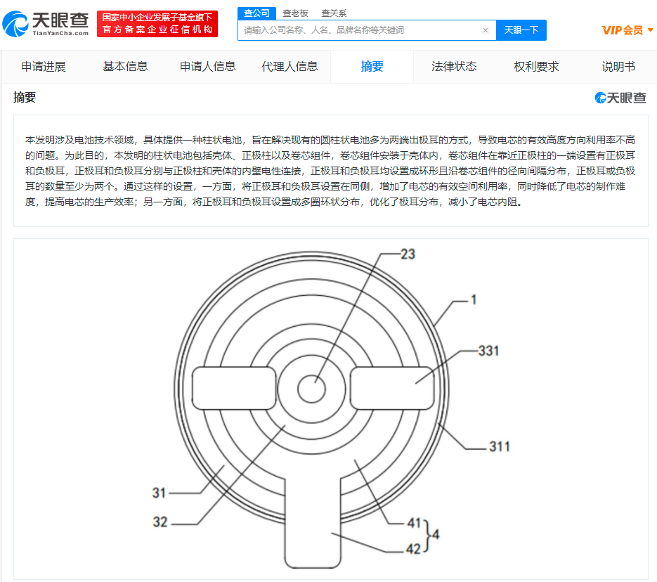 据天眼查App显示,近日,蔚来汽车科技(安徽)有限公司“柱状电池”专利公布。摘要显示,本发明的柱状电池包括壳体、正极柱以及安装于壳体内的卷芯组件,其正极耳和负极耳设置在同侧,增加电芯的有效空间利用率,降低制作难度,提高生产效率;正极耳和负极耳设置成多圈环状分布,优化极耳分布,减小电芯内阻。本发明旨在解决现有的圆柱状电池多为两端出极耳的方式,导致电芯的有效高度方向利用率不高的问题。