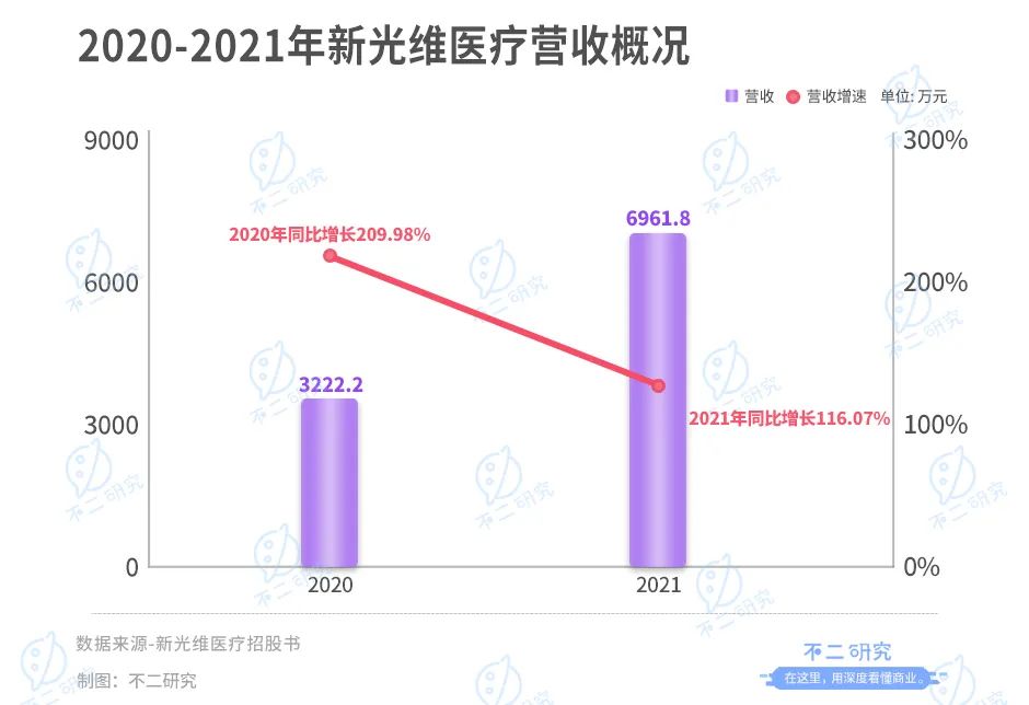 在众多明星资本的加持下,新光维医疗成长迅速,营收情况也没有让投资者失望。据招股书显示,2020及2021年,新光维医疗取得营收3222.20万元,6961.80万元,分别同比增长209.98%,116.07%,营收均呈跨越式增长。