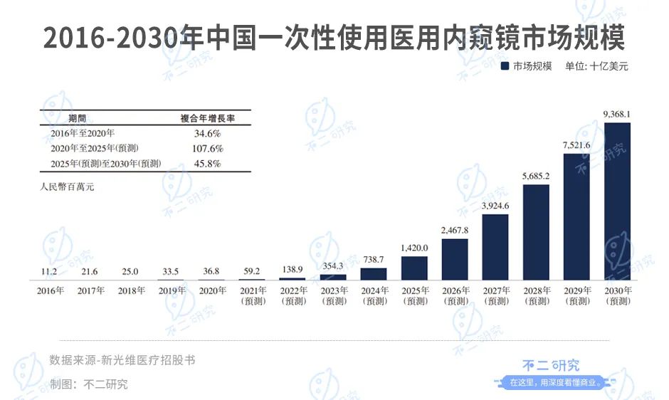 而进一步到一次性医用内窥镜市场,据弗若斯特沙利文数据显示,中国一次性医用内窥镜2020年市场规模为0.37亿元,预计到2025年将增至14.20亿元,年复合增长率为107.6%,到2030年将增至93.68亿元,年复合增长率为45.8%。