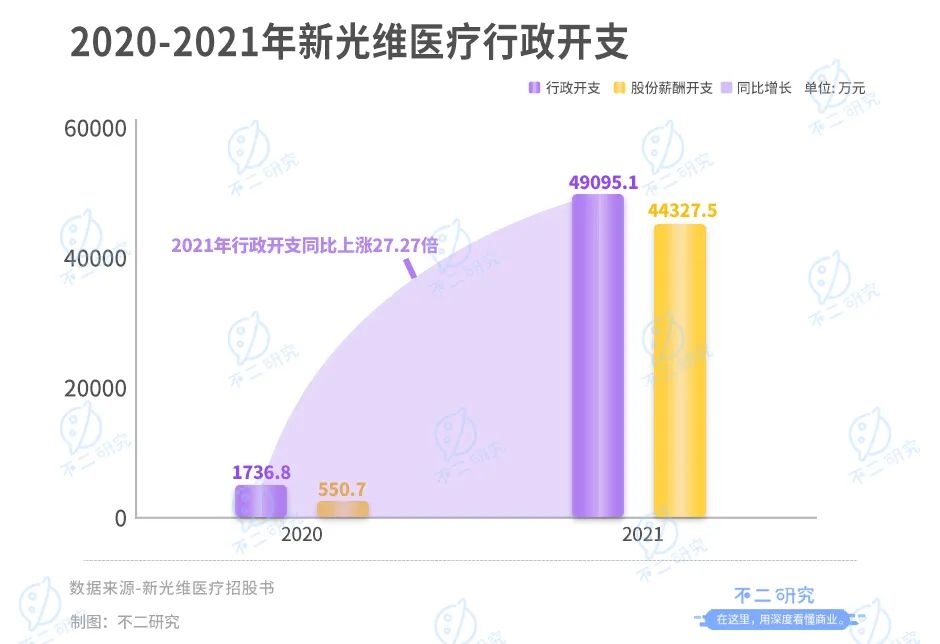 再看行政开支,据其招股书显示,新光维医疗2020及2021年的行政开支分别为1736.8万元和49095.1万元,2021年行政开支同比上涨27.27倍。行政费用上涨如此之多的主要原因在于新光维医疗的股份薪酬开支从2020年的550.7万元增至44327.5万元,此项开支对于上市前企业并不罕见,在上市前进行对员工授予股权以此激励员工。