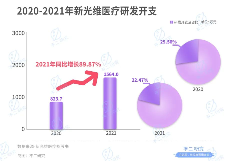 最后看研发开支,据新光维医疗招股书显示,其2020及2021年研发开支分别为823.7万元和1564.0万元,2021年同比增长89.87%。2020和2021年的研发开支分别占其营收比例为25.56%和22.47%。