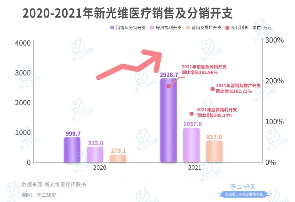 据其招股书显示,新光维医疗2020年及2021年所产生的销售及分销开支分别为999.7万元及2928.7万元,2021年同比增长192.96%。其中,增长最为明显的是雇员福利开支和营销及推广开支,2021年分别同比增长105.24%和192.73%。显然,新光维医疗正不断加大产品推广的费用以此推广现有产品。