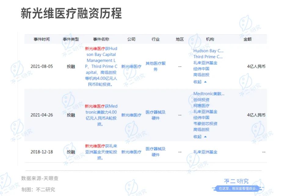 据天眼查数据显示,新光维医疗由2018年12月获利来亚洲基金天使轮投资,2021年4月完成4亿元的A轮融资,本轮融资由高瓴创投、礼来亚洲基金联合领投,经纬中国、美敦力等参投。