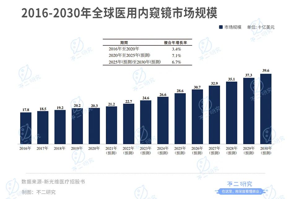 据弗若斯特沙利文数据显示,2020年全球医用内窥镜市场的市场价值为203亿美元,预计2030年将增至396亿美元,复合年增长率为6.9%。而2020年中国的医用内窥镜市场价值为231亿元,预计到2030年将增至624亿元,复合年增长率为10.5%。