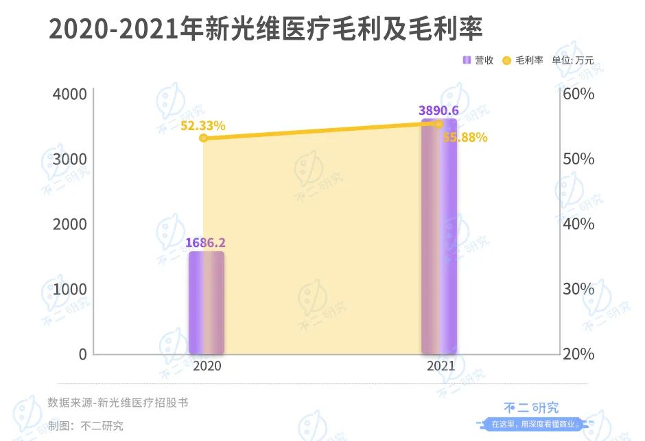 细究新光维医疗的财务结构,「不二研究」发现新光维医疗的毛利并不低,据其招股书显示,新光维医疗2020及2021年的毛利分别为1686.2万元和3890.6万元,对应毛利率为52.33%,55.88%。