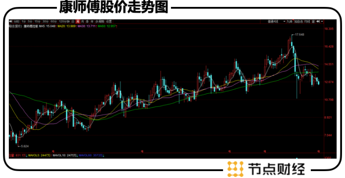 今年2月底之后,康师傅的股价开始了一轮暴跌。截至6月16日收盘,其股价为12.48港元/股,相较2月23日其17.65港元/股的历史最高点,下跌幅度约为29.29%。