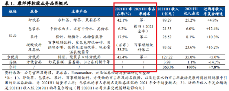 当然,快速跟进也是康师傅的优点之一,近年来结合无糖趋势,其饮料业务也获得了不错的增长。2021年,康师傅在即饮茶市场的份额达到43.4%,位于行业首位。