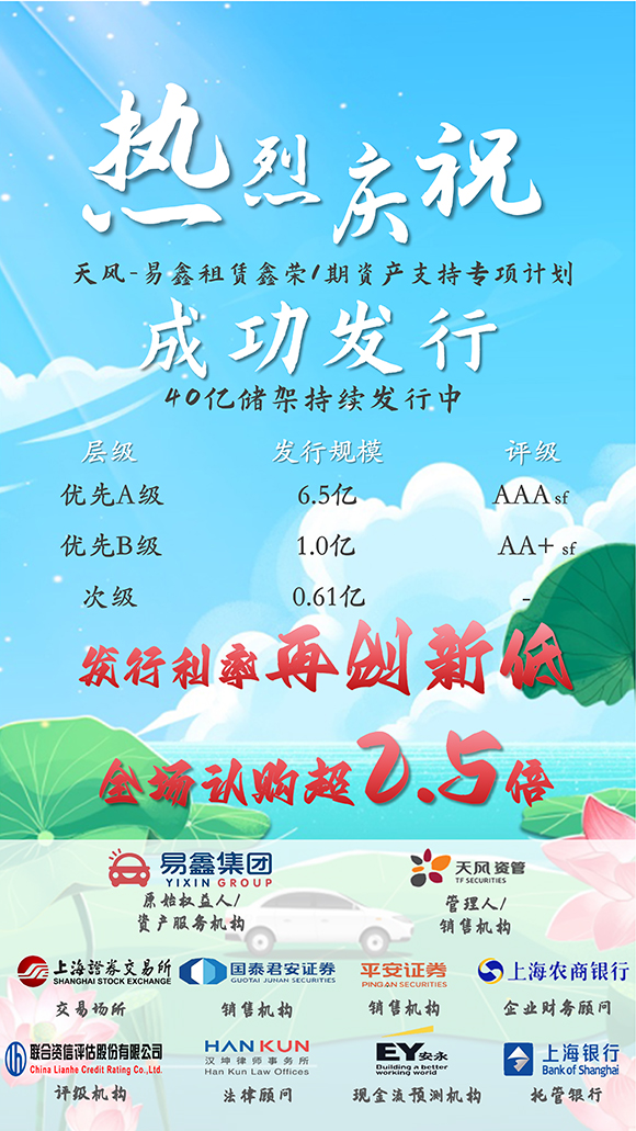 6月17日,上海易鑫融资租赁有限公司(以下简称“易鑫租赁”)成功发行“天风-易鑫租赁鑫荣1期资产支持专项计划”,募集资金8.11亿元(人民币,下同)。这是易鑫租赁本月获批的40亿元新储架额度中的第一期。本次发行得到了新老投资人的大力支持,认购倍数创下新高,发行利率亦为近年来新低的水平。