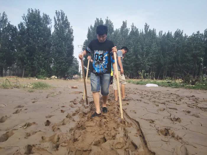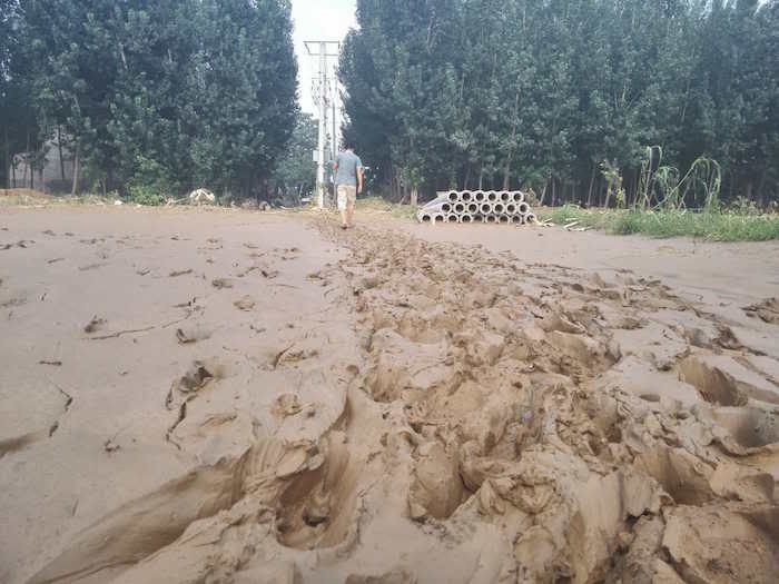 进村出村的柏油马路在洪水过后覆盖上厚厚的一层沙泥,村民拄着木棍试探着出村。
