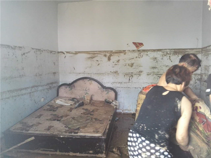 洪水过后,村民往外搬东西。这个房间里清晰可见的水位痕迹记录着那一夜的恐怖,老两口踩在窗口上捡回了一条命。