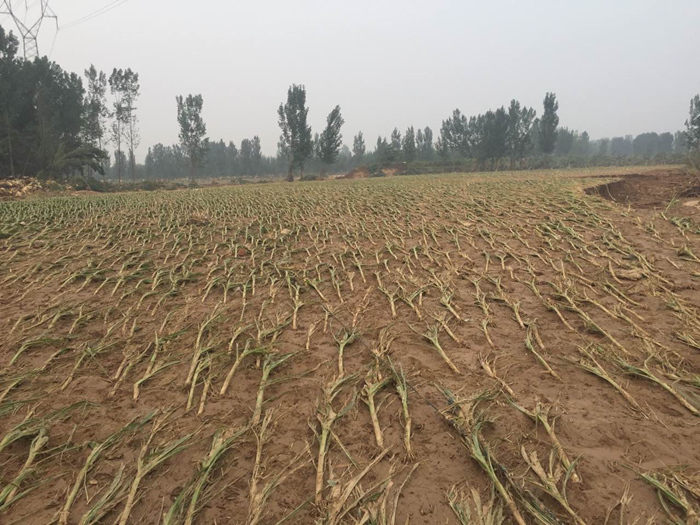 洪水的巨大冲击将铺设在沟内尚未被淹埋的管道冲击到路边。