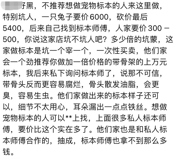 8000块做标本这件事本身也有极大水分。标本师只给出了大概完成标本的时间,以及之前做过的标本示例,具体怎么做,每个环节对应的消费金额是多少、应用到了什么制作工艺等,一概是模糊的。