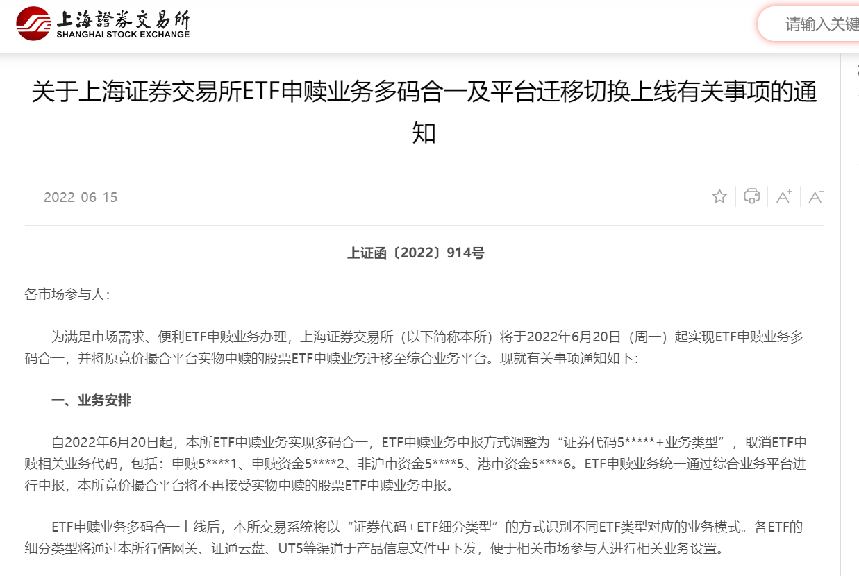 这和上交所6月15日发布的《关于上海证券交易所ETF申赎业务多码合一及迁移上线切换有关事项的通知》有关。通知显示,上交所将于6月20日(下周一)起实现ETF申赎业务多码合一,并将原竞价撮合平台实物申赎的股票ETF申赎业务迁移至综合业务平台。