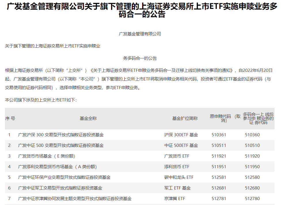 今日,广发、工银瑞信等多家基金公司发布《关于旗下管理的上海上市ETF实施申赎业务多码合一的公告》。