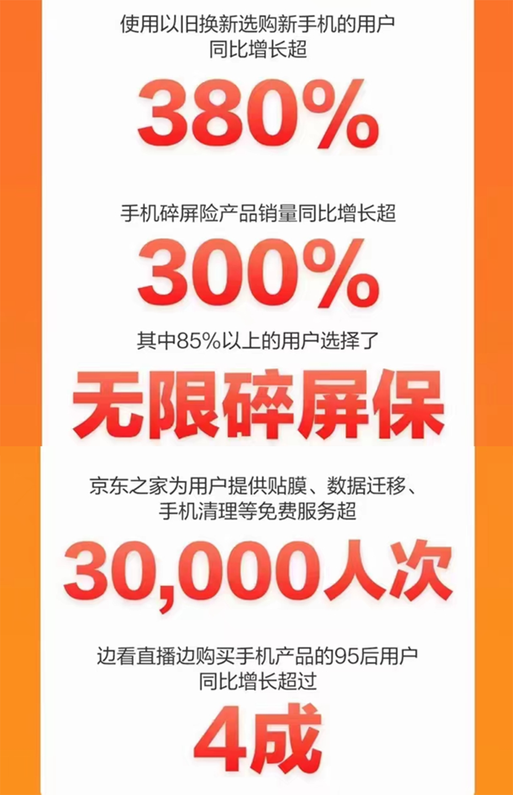 比如“以旧换新购机”用户同比增长了380%、手机碎屏险销量同比增长了300%、边看直播边购买手机产品的95后用户同比增长超过4成,京东甚至还统计了京东之家为用户提供贴膜、数据迁移、手机清理等免费服务超过3万人次。