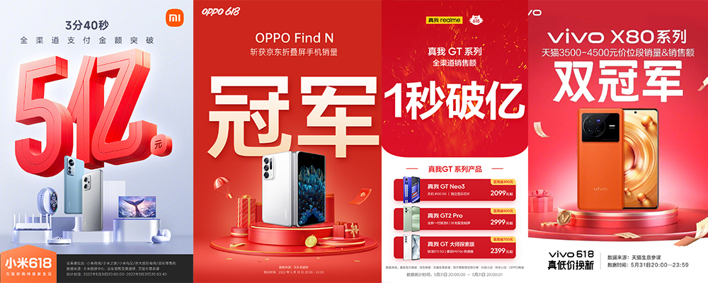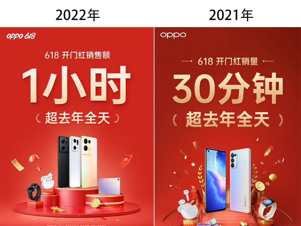 在OPPO的战报中,还有一点值得注意,就是今年OPPO并没有提到手机整体销量的同比增长情况,而在2021年的618战报中,OPPO特别提到,手机开门红销量30分钟超过了去年全天,而同比增长达到了370%。