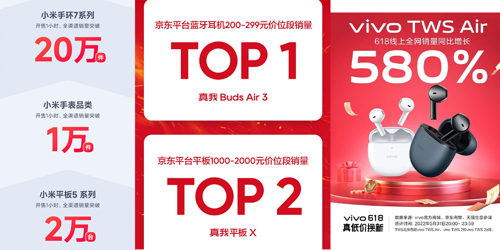 在小米、OPPO等厂商的战报中,我们也能明显看到,有不少耳机、平板和手表的销量都被单独提及,并作为重点成绩被写在战报的醒目位置。
