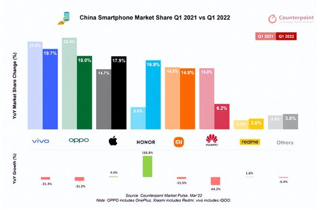 数据显示,手机市场集中度逐年上升。据Coumterpoint统计,2022年第一季度,华为、荣耀、OPPO、vivo、小米、苹果等主流品牌之外,“Others”之列的生存空间共计为3.8%。
