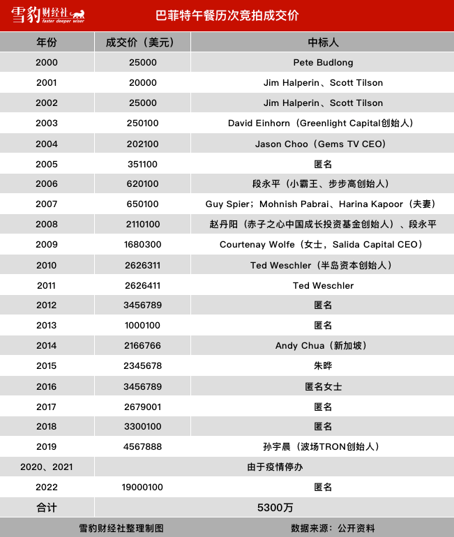 该匿名者将最多可携带7人,与巴菲特共进3小时的午餐,当面聆听股神的教诲。