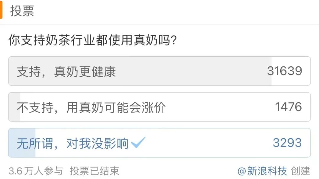 在新浪科技发起的一项“你支持奶茶行业都使用真奶吗?”的投票活动中,共有3.6万人参与投票,其中支持“支持,真奶更健康”的用户,约占86.1%。
