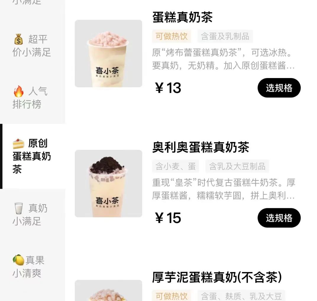 尴尬点在于,喜小茶在用料上依旧沿用喜茶“鲜奶鲜茶”的主张,但为了保证平价,鲜果茶类产品寥寥无几,主打“奶茶为打底+蛋糕等小料”的常规奶茶。