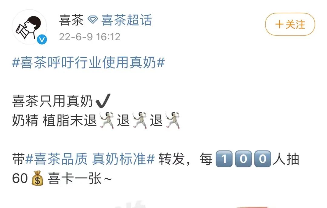 “奶精,植脂末退退退”,近日喜茶在自家官微发布了“真奶”倡议。事件背景是正值中国第25个全国乳品营养周,喜茶在6月9日通过官方微博和微信,发布了一份《喜茶品质真奶标准》。