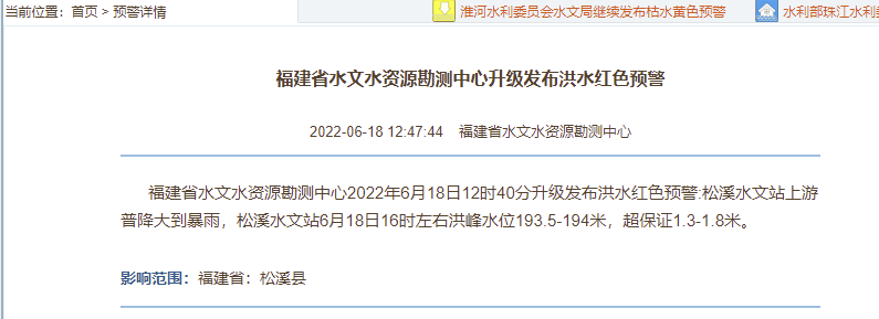 水利部水文情报预报中心网站消息,福建省水文水资源勘测中心2022年6月18日12时40分升级发布洪水红色预警:松溪水文站上游普降大到暴雨,松溪水文站6月18日16时左右洪峰水位193.5-194米,超保证1.3-1.8米。