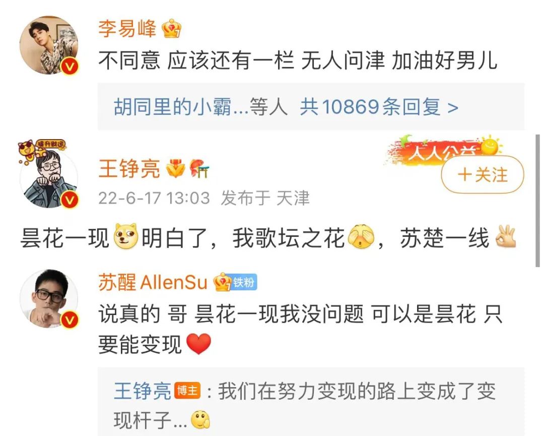 本是些调侃性质的野榜,岂料各路粉丝自吹自嗨、彼此内涵、对呛护主,咱就说内娱好久没见过这般热闹光景。连正主明星也下场狂欢,李易峰自嘲点评把 #李易峰 无人问津加油好男儿# 送上热搜,王铮亮发博、好兄弟苏醒回应“可以是昙花,只要能变现”,星粉合力推着 #野榜# 等连带热搜呈刷屏之势。