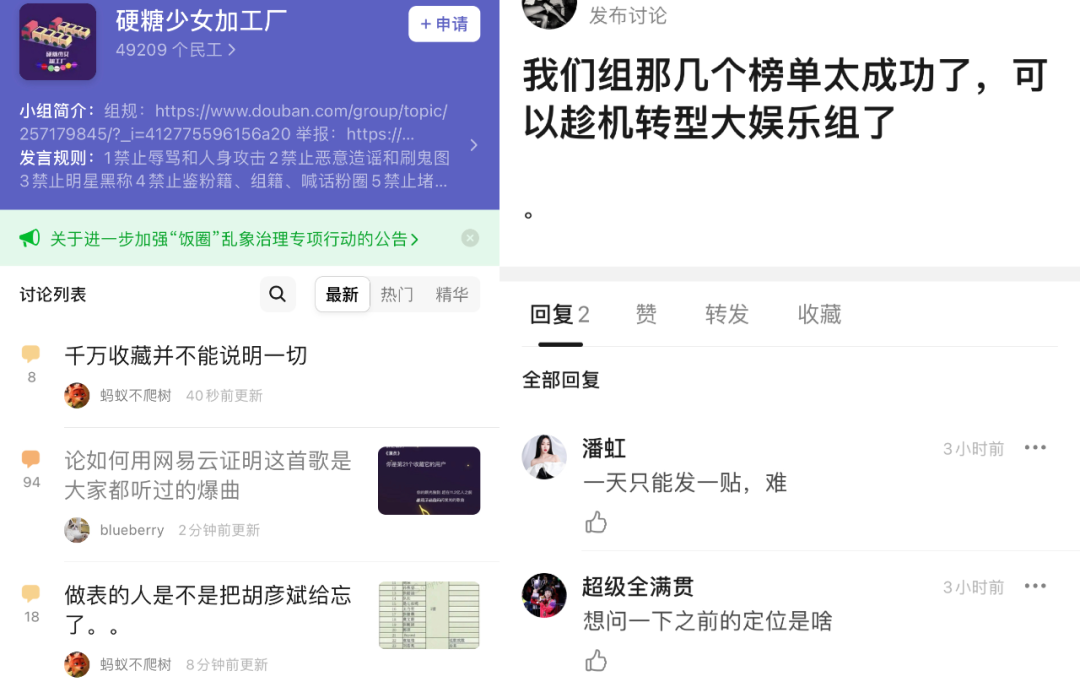 艺人社区里,用户日常最大爱好是“踩对家”;综合小组里,用各维度指标排列组合地PK各路明星,是绝不会错的保底热帖。后者促成了豆瓣鹅组、百度g-music吧等颇具站外影响力的娱乐大组,他们常年热衷举办“明星比较大会”。有些意外的是,如今这波“自制野榜”的出产地,却来自一个纯纯的艺人小组。