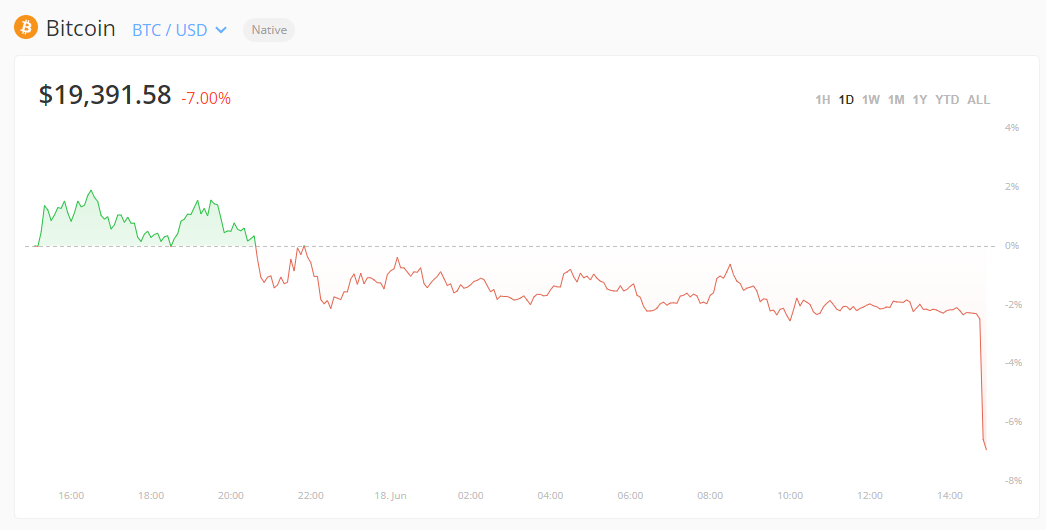 比特币日内跌超7%,现报19391.58美元/枚
