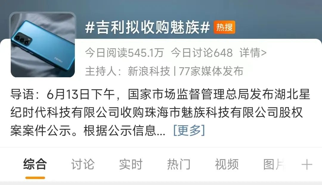 同在本周,据国家市场监督管理总局官网显示,一份内容为湖北星纪时代科技有限公司(下称“星纪时代”)收购珠海市魅族科技有限公司(下称“魅族科技”)的股权案被公示出来,一时间引发了行业内外的关注,甚至登上了微博热搜。