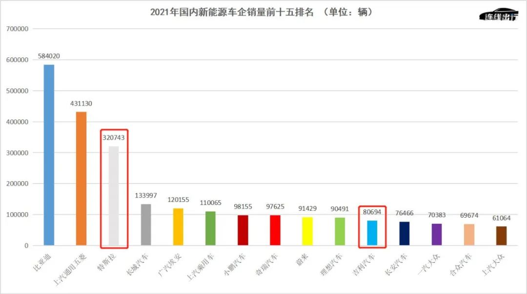 2021年国内新能源车企销量前十五排名,数据来源于乘联会,连线出行制图