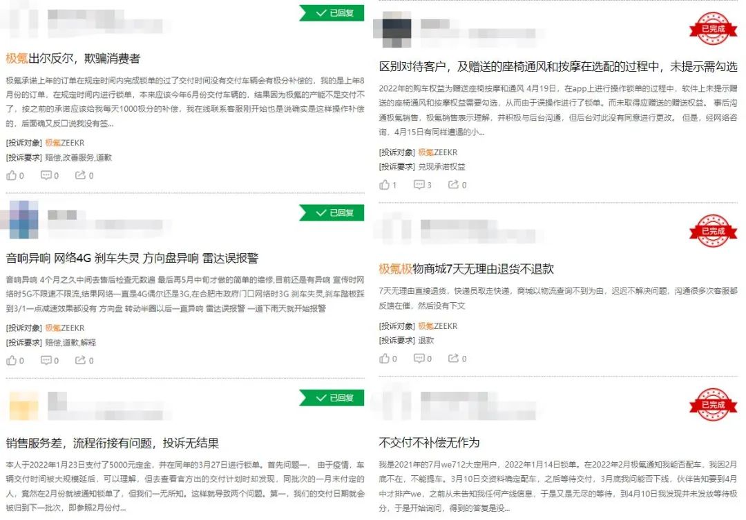 部分极氪车主的投诉,截图自黑猫投诉官网