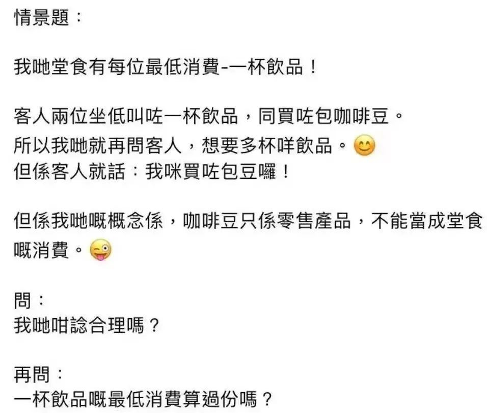 但老板认为咖啡豆属于零售产品,不能当成堂食的消费。因此老板发帖询问,并提出了两个问题:这样的想法合理吗?人均低消一杯饮品过分吗?