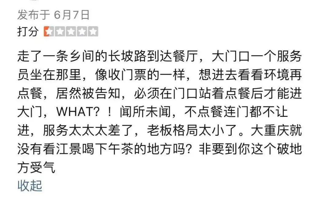 上文提到的重庆咖啡馆,最新的差评中,顾客表示,“想看看环境再点餐都不行”,这对于本身就对“不点单不让进”就颇有微词的顾客来说,无疑是再一次激怒。