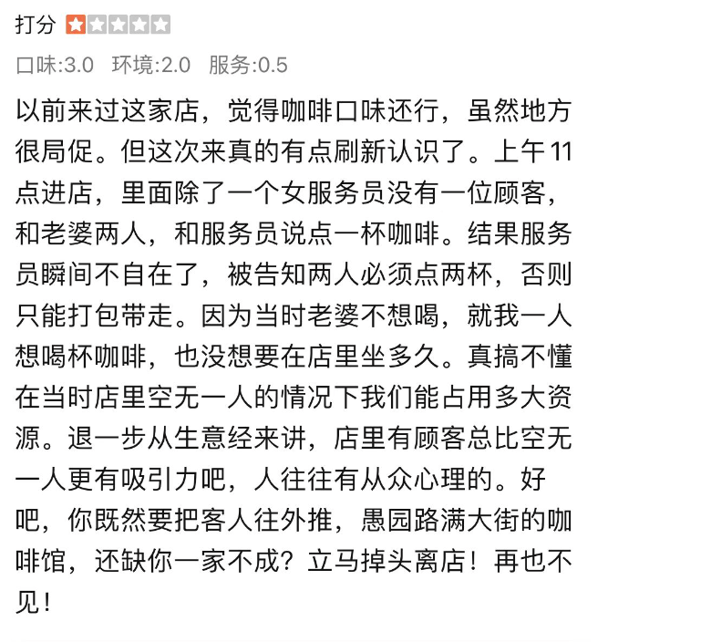 再比如另一家店,在店内空无一人情况下,也要求两人必须点两杯,结果顾客直接选择了掉头离店。