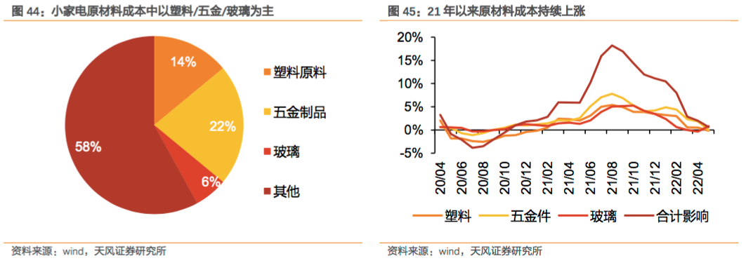 家电、小家电的生产制造,主要以PP、ABS、AS等塑料类材料,不锈钢、镀铝板等五金材料,玻璃为主,除此之外还有温控器、IC集成块、熔 断器、电线、电机等零部件。且直接原材料约占新宝股份主营业务成本的七至八成,占比较高。