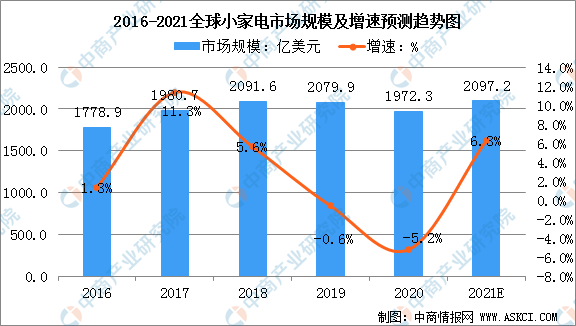 近年来,全球小家电市场规模增速有所乏力,特别是2019年、2020年,出现连续下滑。