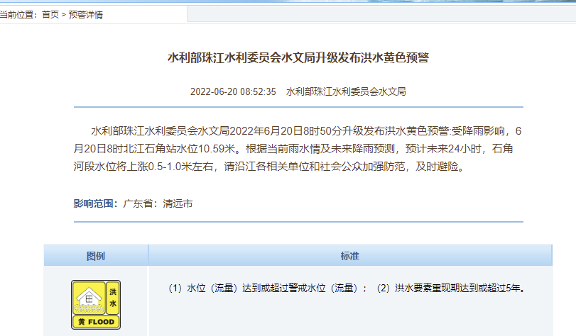 水利部水文情报预报中心网站消息,水利部珠江水利委员会水文局2022年6月20日8时50分升级发布洪水黄色预警:受降雨影响,6月20日8时北江石角站水位10.59米。根据当前雨水情及未来降雨预测,预计未来24小时,石角河段水位将上涨0.5-1.0米左右,请沿江各相关单位和社会公众加强防范,及时避险。