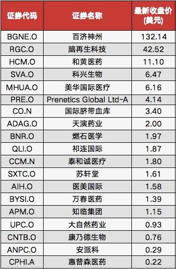 美股医药上市公司股价(数据来源:Choice,不完全统计)