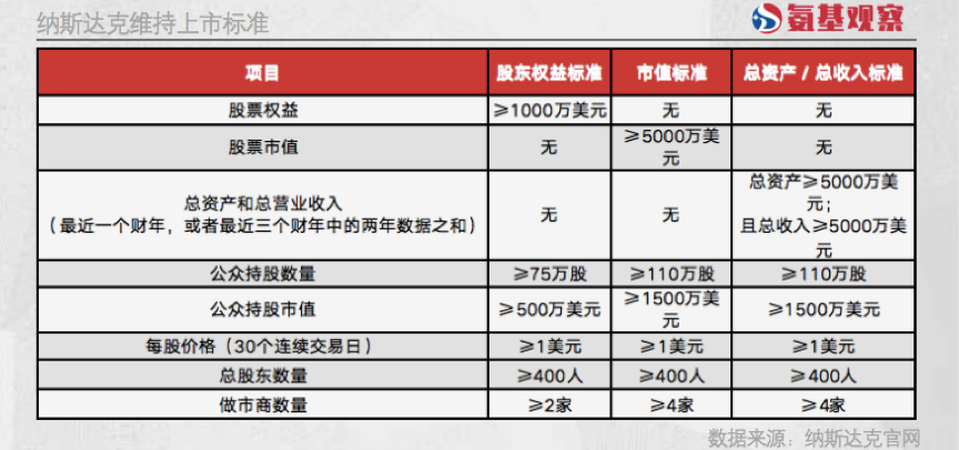 那么,纳斯达克维持上市的标准高不高呢?说高不高,说低也不低。具体来看,大致分为两个必备条件和三个可选标准。