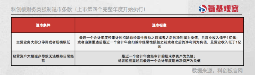 为此,科创板设立了财务类强制退市条款,针对创新药企在上市的第四个完整年度实施。具体来看,科创板财务类强制退市条件,参照了港股的条款,主要分为三点,分别为: