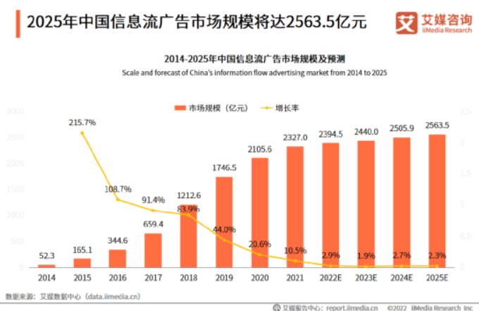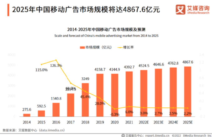 据艾媒网数据显示,2025年中国信息流广告市场规模将达2563.5亿元,2025年中国移动广告市场规模将达4867.6亿元,虽然未来广告市场规模增速减缓,但是未来的增长规模依旧可观,所以在此基础上,下沉市场的展开变成了电商增长的突破点。